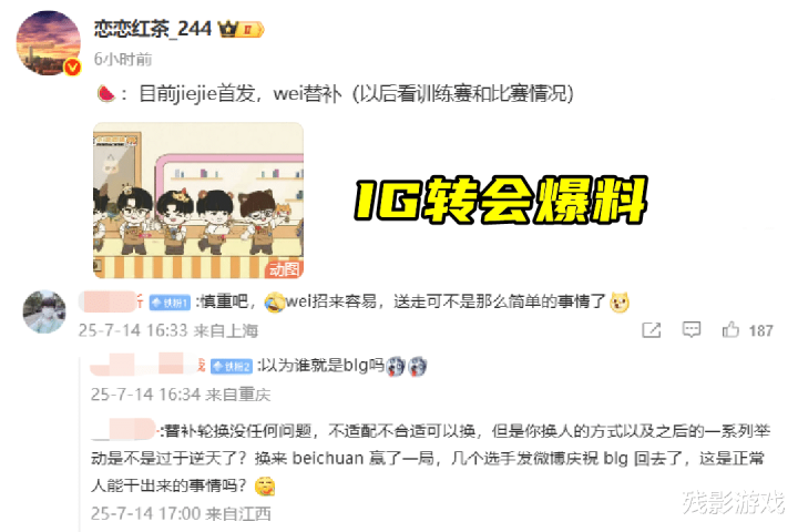 这个剧本相信大家在BLG也已经看过了,Wei又何尝不是这样被抬离首发的。只不过圈内对于Wei离队的内幕爆料并没有多少,离队的视频也看不出什么问题。只有在BLG遭AL零封出局MSI时,Wei给姿态直播间刷了一个1000的某牙一号,这才看出来他和BLG并不是好聚好散。不过话又说回来了,如果第三赛段IG对阵BLG之时上小Wei,那这“复仇”老东家的剧情可就有意思了。